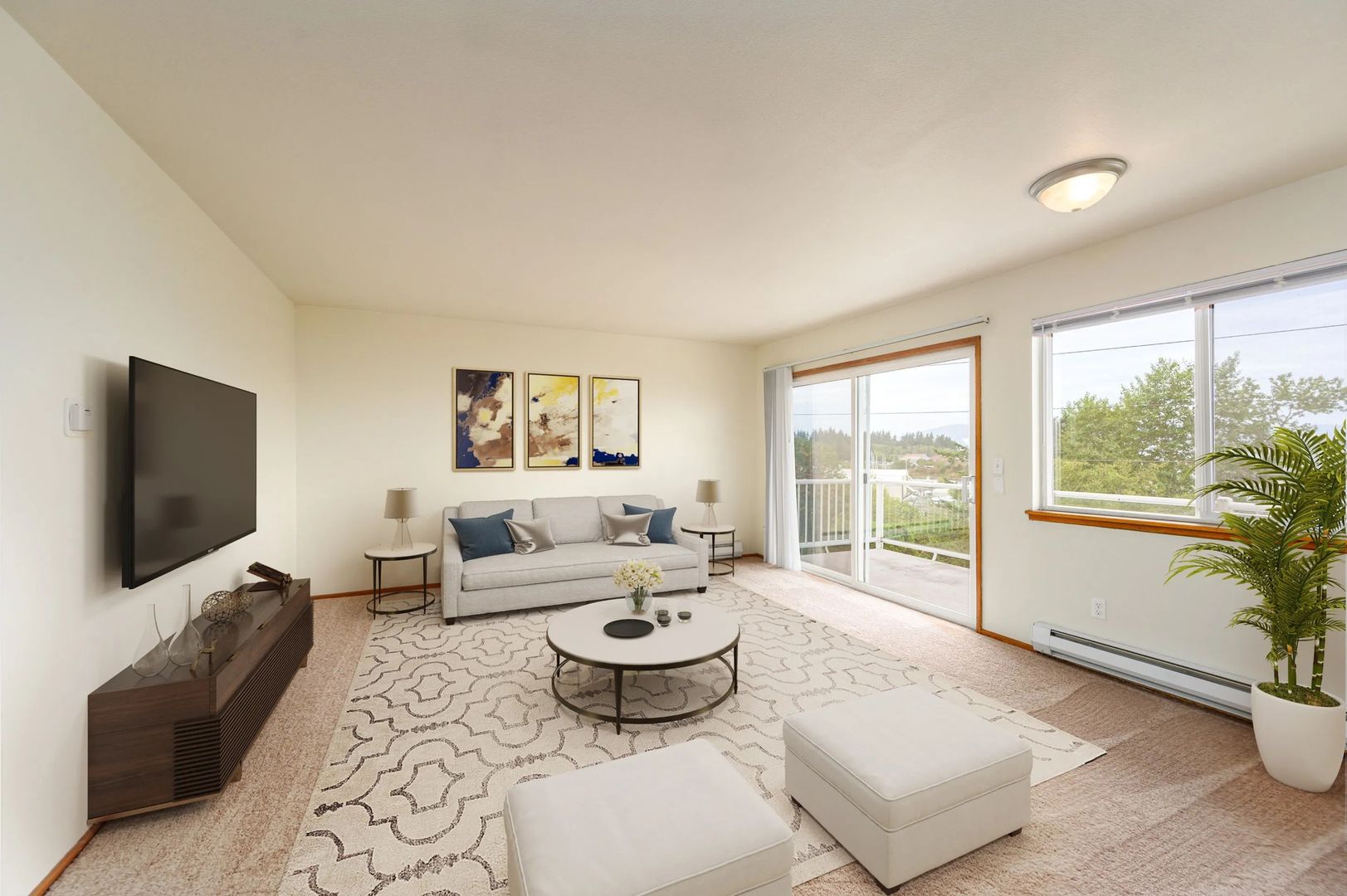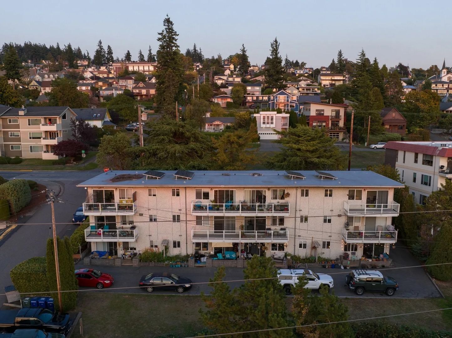 Second- and third-floor units (#5 through #12) have Bellingham Bay & island views from a private balcony; first-floor units (#1 through #4) have a private patio. The living/dining area of each unit has air conditioning, and heat pump heating, provided by a ductless mini split heat pump.