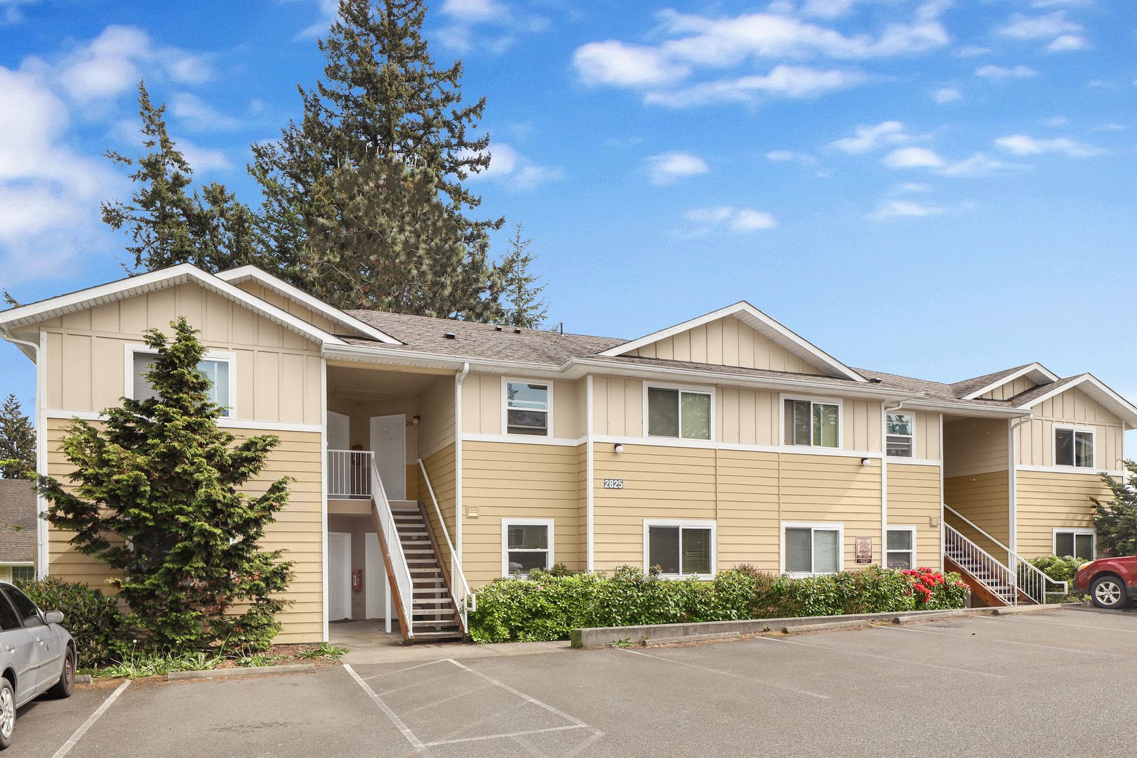 Permitted parking lot, each unit receives two assigned spaces (with the exception of units 2827-103, 2831-103, 2831-105, 2835-107 as these only receive one spot). No guest or overflow parking is available. Street parking permitted on a first-come first-served basis.